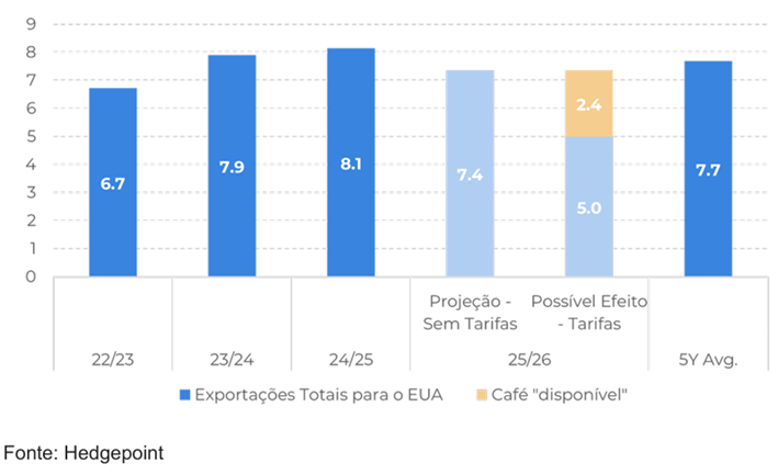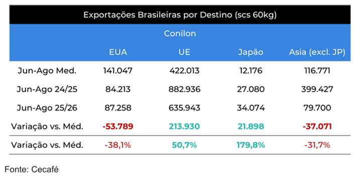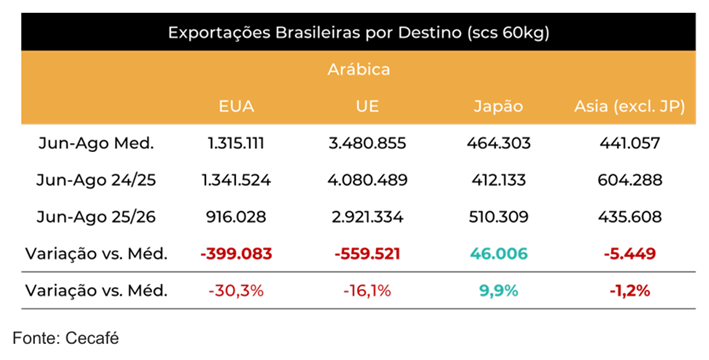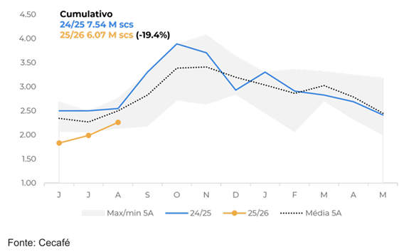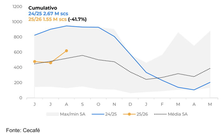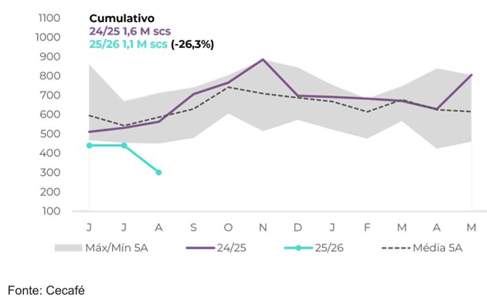 O desempenho também está muito abaixo dos números médios de exportação para o país. Cumulativamente, os embarques do Brasil para os EUA também estão abaixo de 2024 e da média, com volume total de 1,1 M de sacas em 25/26 (jun-ago), queda de 26,3% em relação aos 1,6 M sacas de 24/25.
